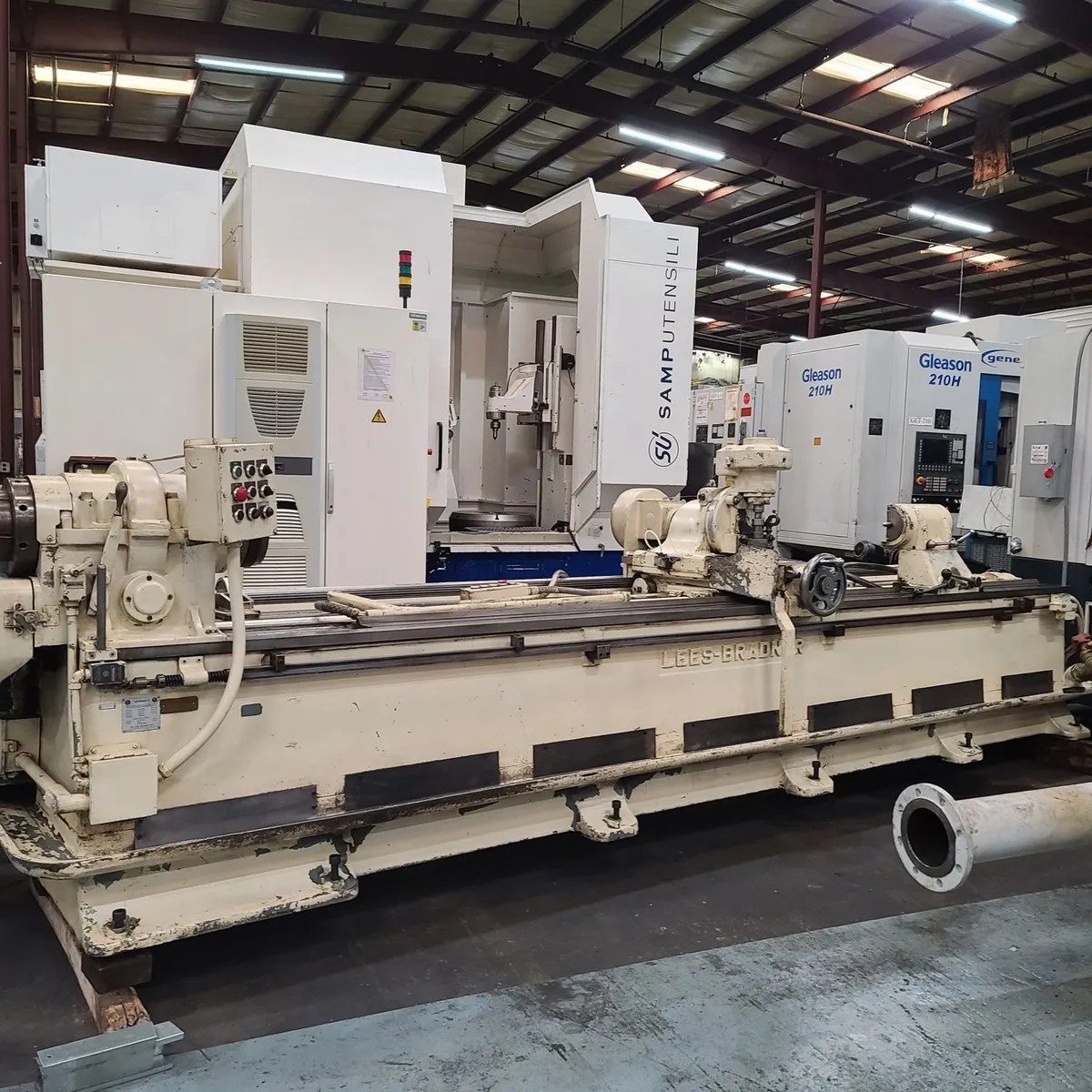 Lees-Bradner Model SH Long Bed Horizontal Spline Hobbing machine for cutting long splines on cylindrical parts up to 144" in length between centers. This 12' capacity machine will cut splines in 8.75" diameter shafts and swings 12" over carriage & almost 24" over the ways for external flanges , eyelets, journals , etc. Machine is equipped with push-button controls and rapid traverse to cover long travel distances quickly.